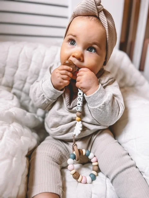 we specialize in custom designs! click the button below to create your own personalized pacifier clip, teething ring, or wristlet keychain.